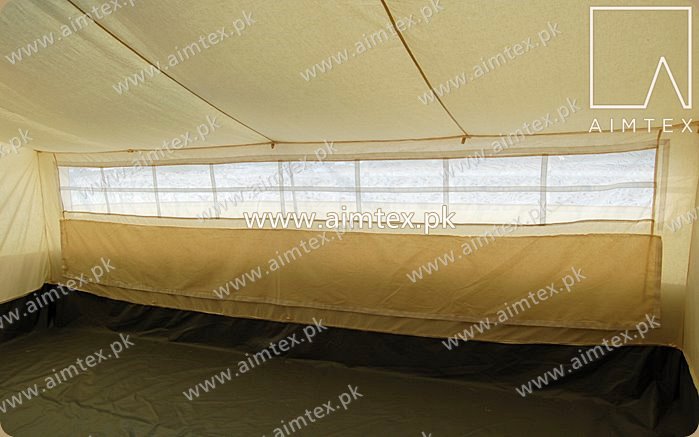Roof : Poly-cotton 350 g/m2 +/- 15% finished state, 30hPa water penetration, fire resistance.